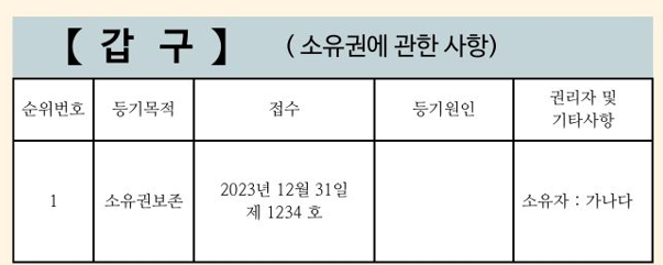 갑구는 소유권에 관한 사항을 기재합니다. 소유권에 관한 정보가 접수일 순으로 나오는데요. 마지막으로 등록되어 있는 권리자가 현재 해당 부동산의 소유자입니다. 부동산계약서에 작성된 소유자와 갑구에 가장 최근에 표기된 소유자의 이름이 신상이 일치한지 살펴봐야 합니다. 짧은 시간에 소유자가 자주 바뀌었다면, 사실 관계를 확인해는 것도 필요합니다. 상속된 부동산이라면 정당한 상속이었는지, 매도인이 법률상 능력을 가지고 있다고 인정되는지도 파악해두는 것이 좋습니다.